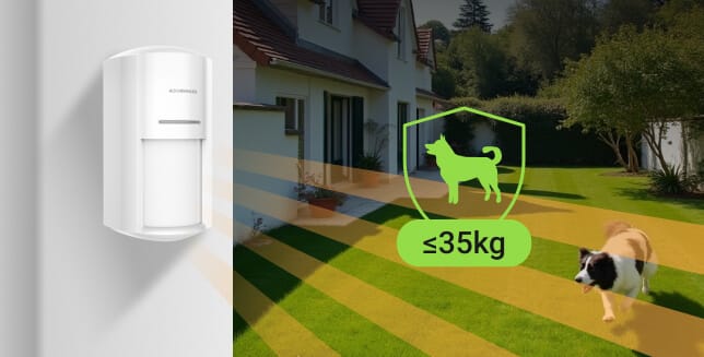 The dual-tech motion detector features a multi-view Fresnel lens design that ignores movements from animals weighing up to 35 kg. This smart pet immunity ensures accurate human detection while minimizing false alarms caused by pets.